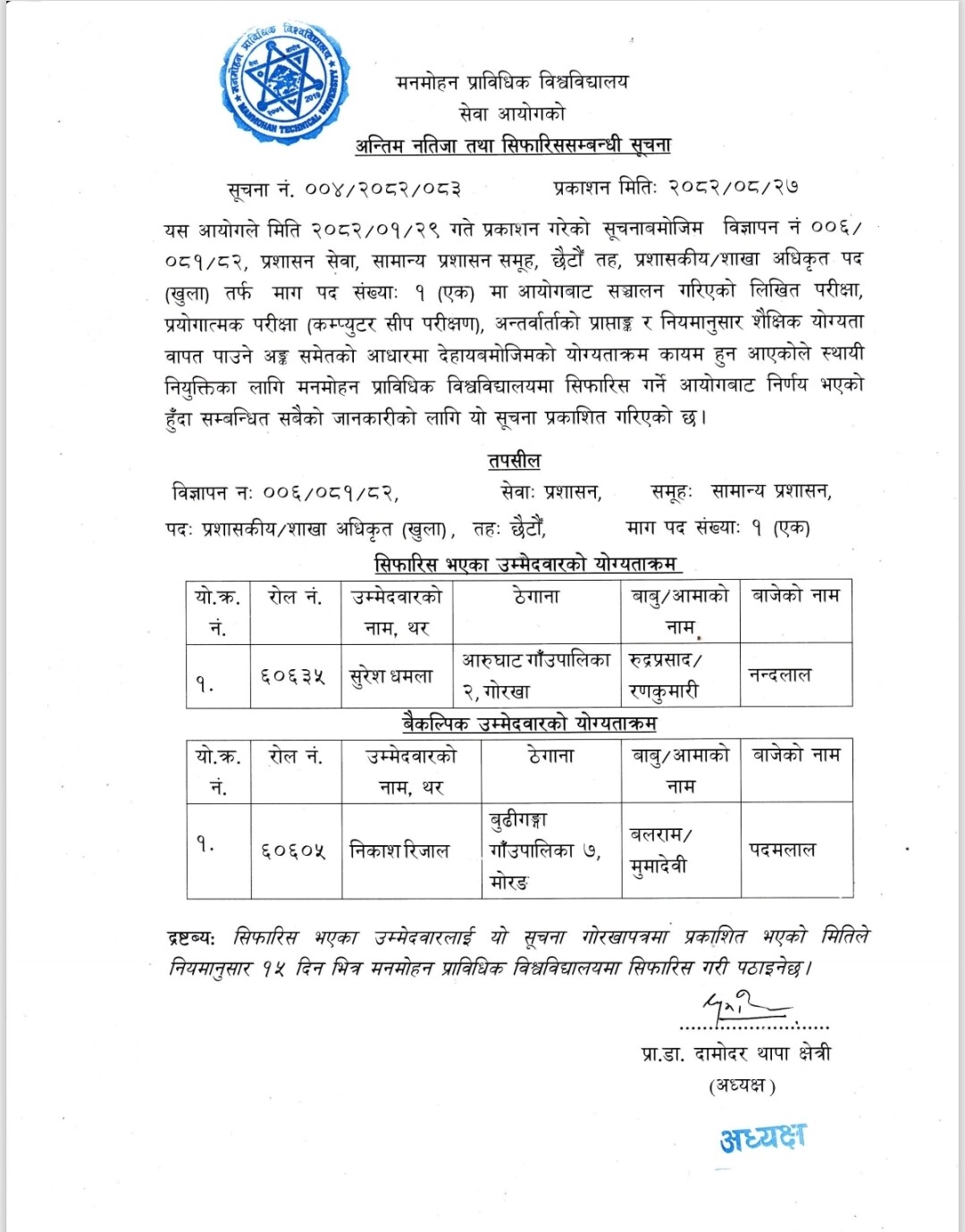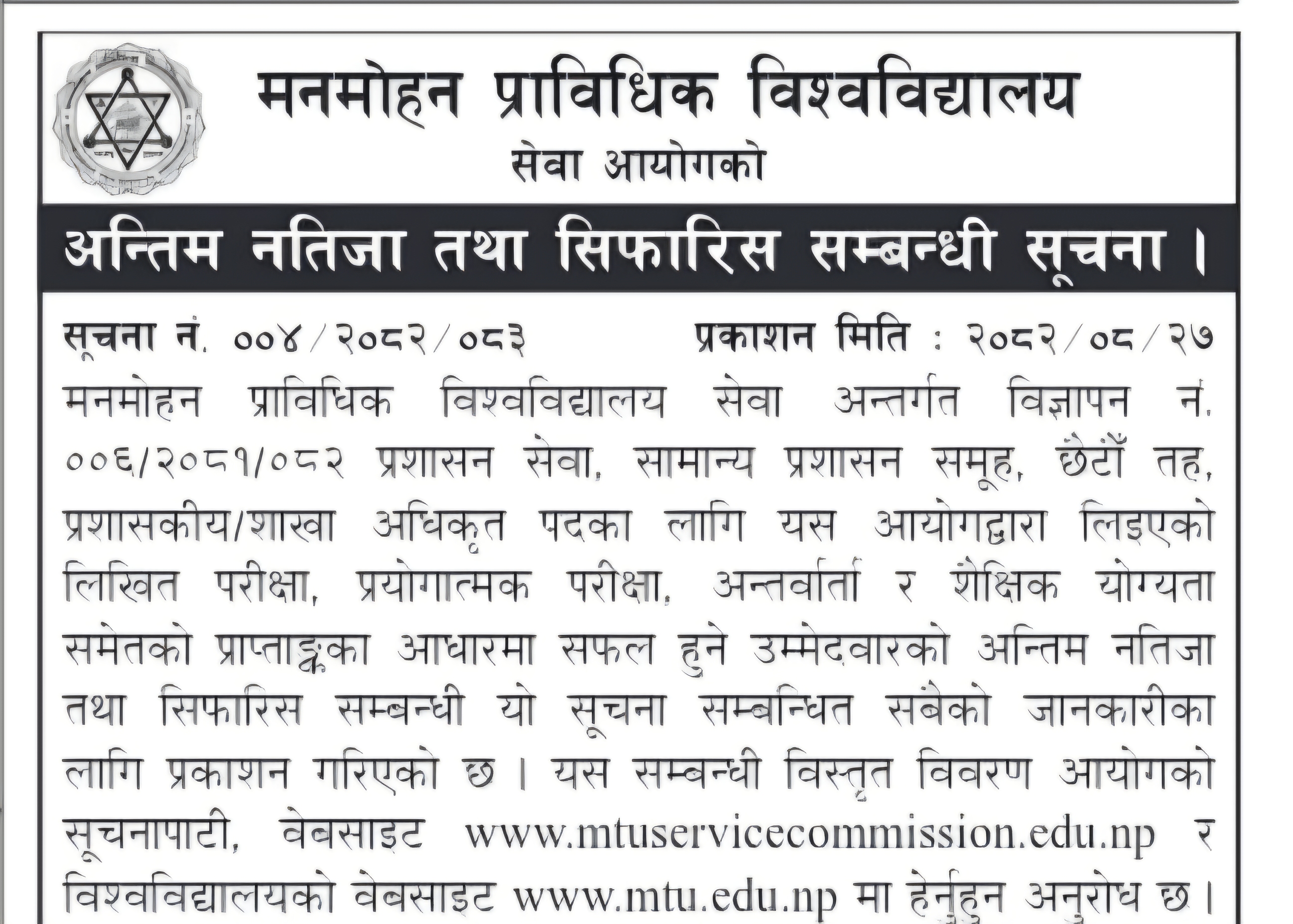 2082-08-27 अन्तिम नतिजा तथा सिफारिसम्बन्धी सूचना